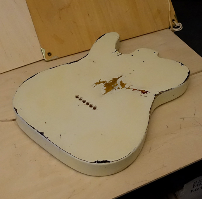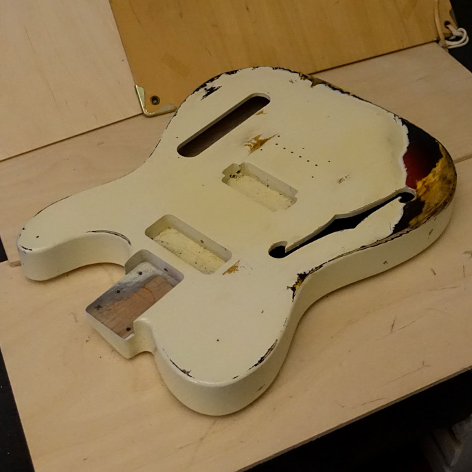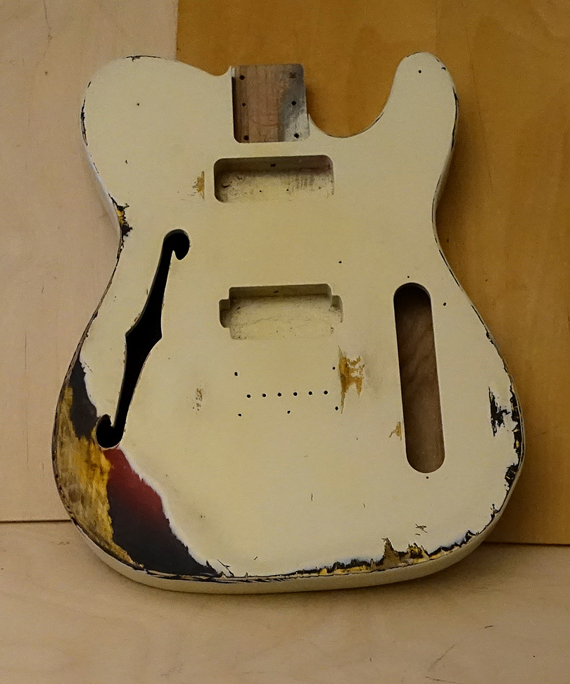 Thin Nitro Finish on an Ash body Thinline. Inside the F Hole has painted black and sealed. Requested from my customer.