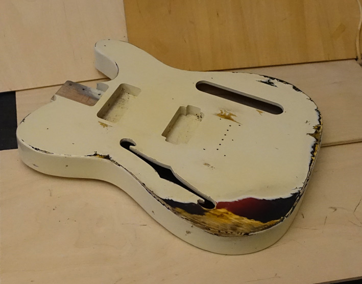 Thin Nitro Finish on an Ash body Thinline. Inside the F Hole has painted black and sealed. Requested from my customer.