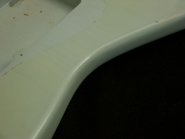 I’ve reliced a new Squier Cyclone. The rosewood and maple boarder at the headstock has been reshaped to the vintage correct shape. Notice the faded color under the pickguard is different from the other part of the body. Also notice the dusts on the body around the pickguard, bridge, and control panel.